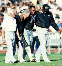 Women’s Association (AMWA). Low estrogen production results in delayed onset of menstruation, which has negative effects on bone growth. These girls have a higher incidence of scoliosis, stress fractures and lower-than-normal bone mineral density (osteopenia). This low bone mineral density may be irreversible. Excessive exercise can also cause trauma to the skeletal system that can lead to back pain. An example is weight lifting with too much weight, or weight lifting out of proper position. Lower back strain can result from exercising too strenuously for one’s fitness level, more common in weekend warriors who are sedentary during the work week. The picture featured to the left is Bo Jackson walking off the field after his tackle where it left him with a shattered hip and the beginning of the end of his short but illustrious football/baseball career. Bo Jackson was my idol growing up being one of the best all-around pro-athletes the world has ever seen while dominating both baseball and football for a few short years! The ‘Bo Knows’ Nike campaign was the biggest thing since Prefontaine and his running coach started Nike in the 1970’s. Bo Jackson took the hits and had it all but had a devastating toll throughout sports with high-impact activities that resulted in the end of his professional sports career. He now takes up golf 🙂
