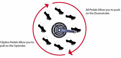 The pedals on spin bikes have both a toe cage (to use with regular running or workout shoes) and a clip (for bike shoes). When you use the cage or the clip, you secure your foot to the pedal, which allows you to pull up as well as push down. If you become a real fan of spinning, you may want to buy the shoes, but make sure the cleats are “SPD” which is what is used on almost all spin bikes.